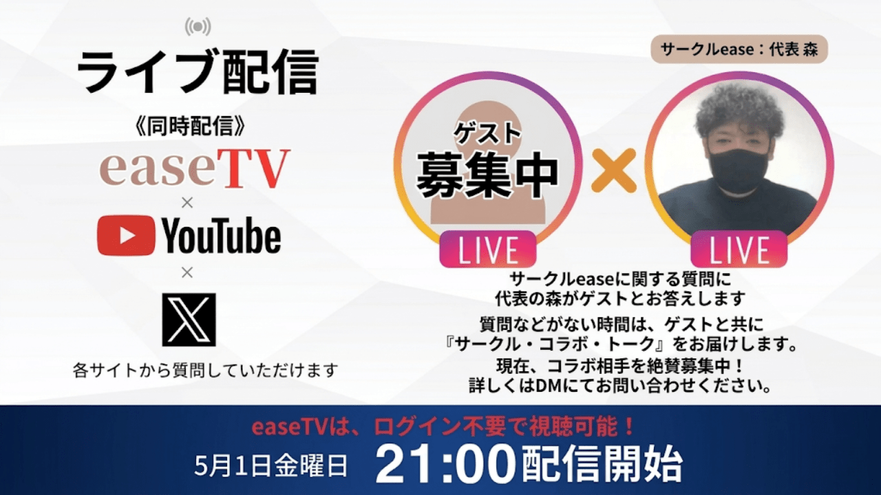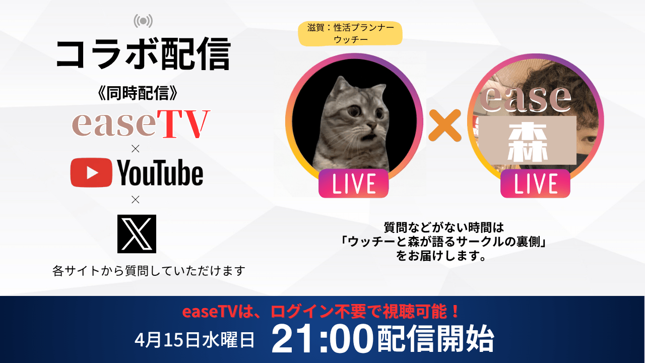毎週1回「easeTV全国ライブ配信ページ」にて、easeに関する質問に代表の森や性活プランナーがリアルタイムでお答えする生ライブ配信開催してます。