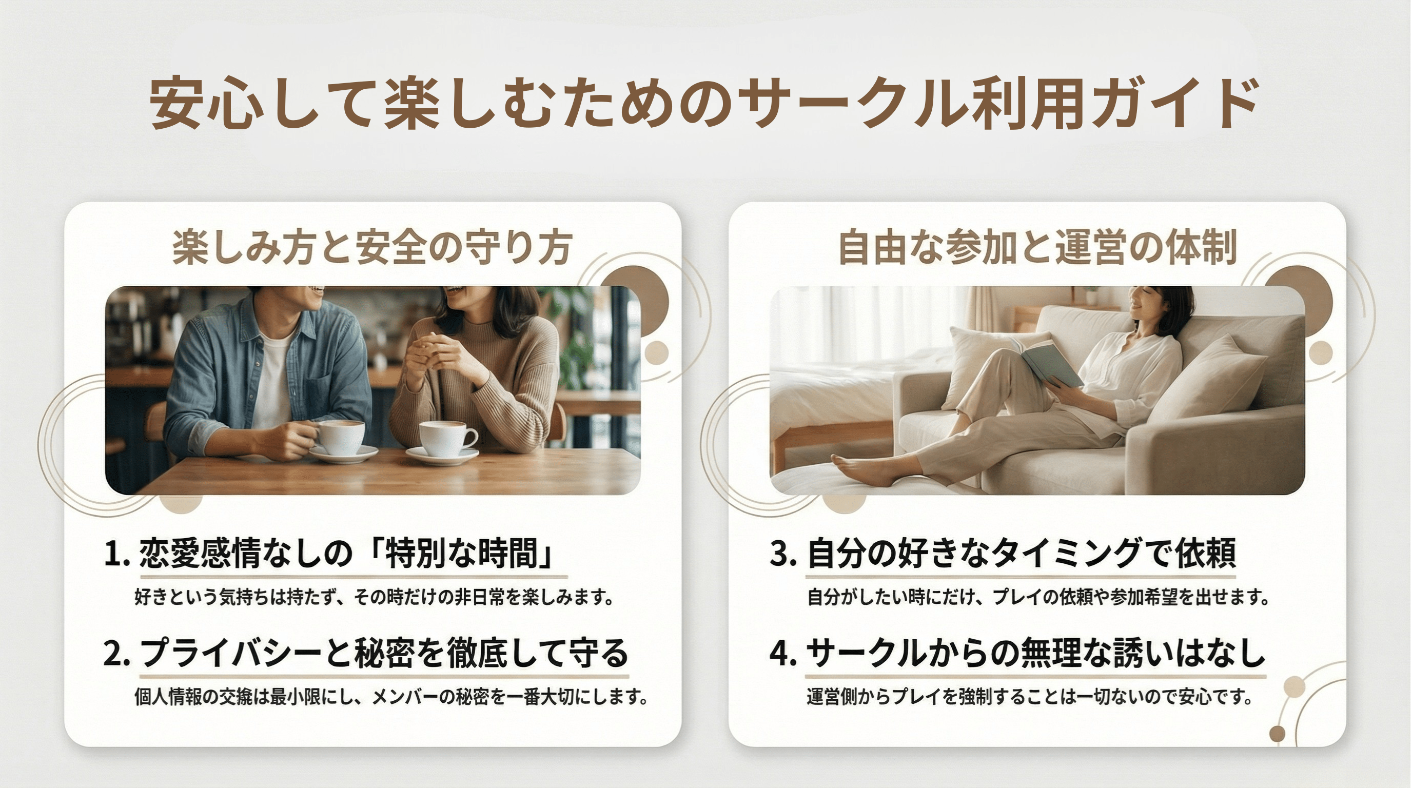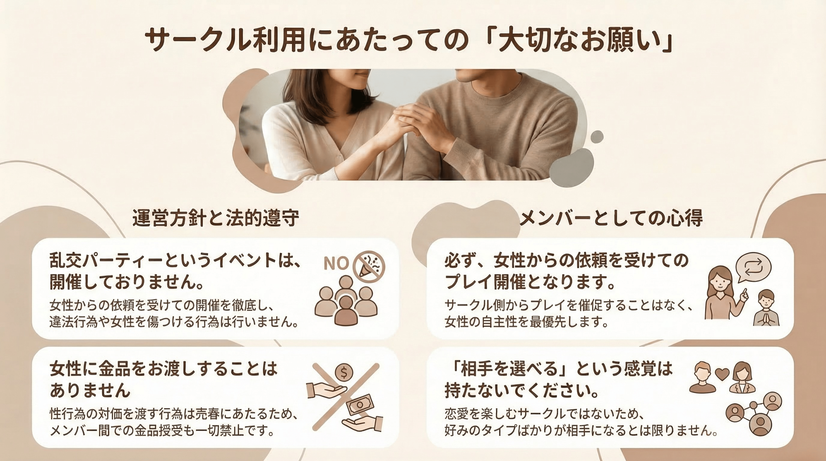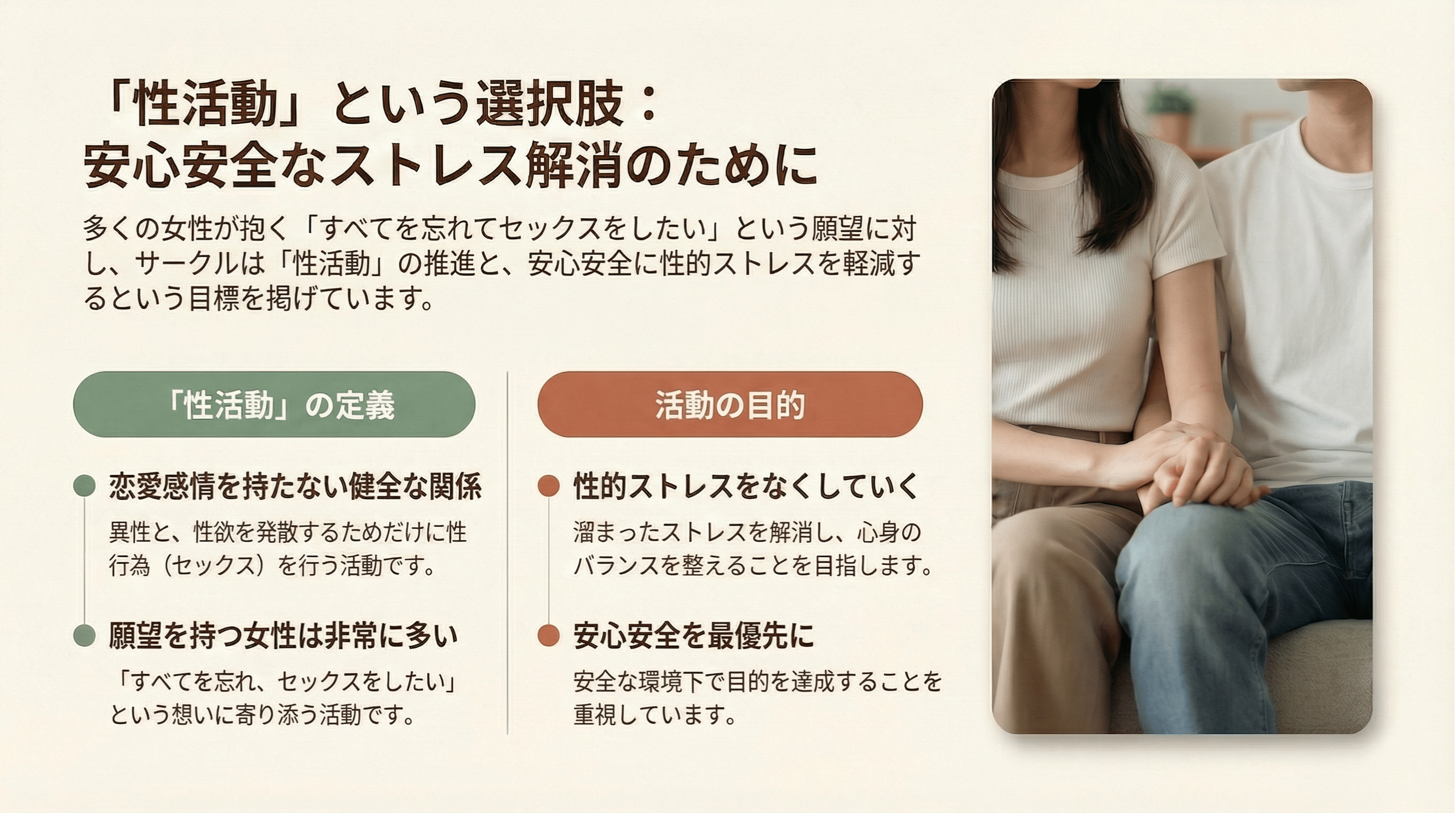 このサークルは、セックスが好きで集まった男女が、サークルのメンバーとして1度会い、お互い恋愛感情を持たずに「非日常時間」を共有し、溢れる性欲を「安心安全」に発散させることを目的としています。
