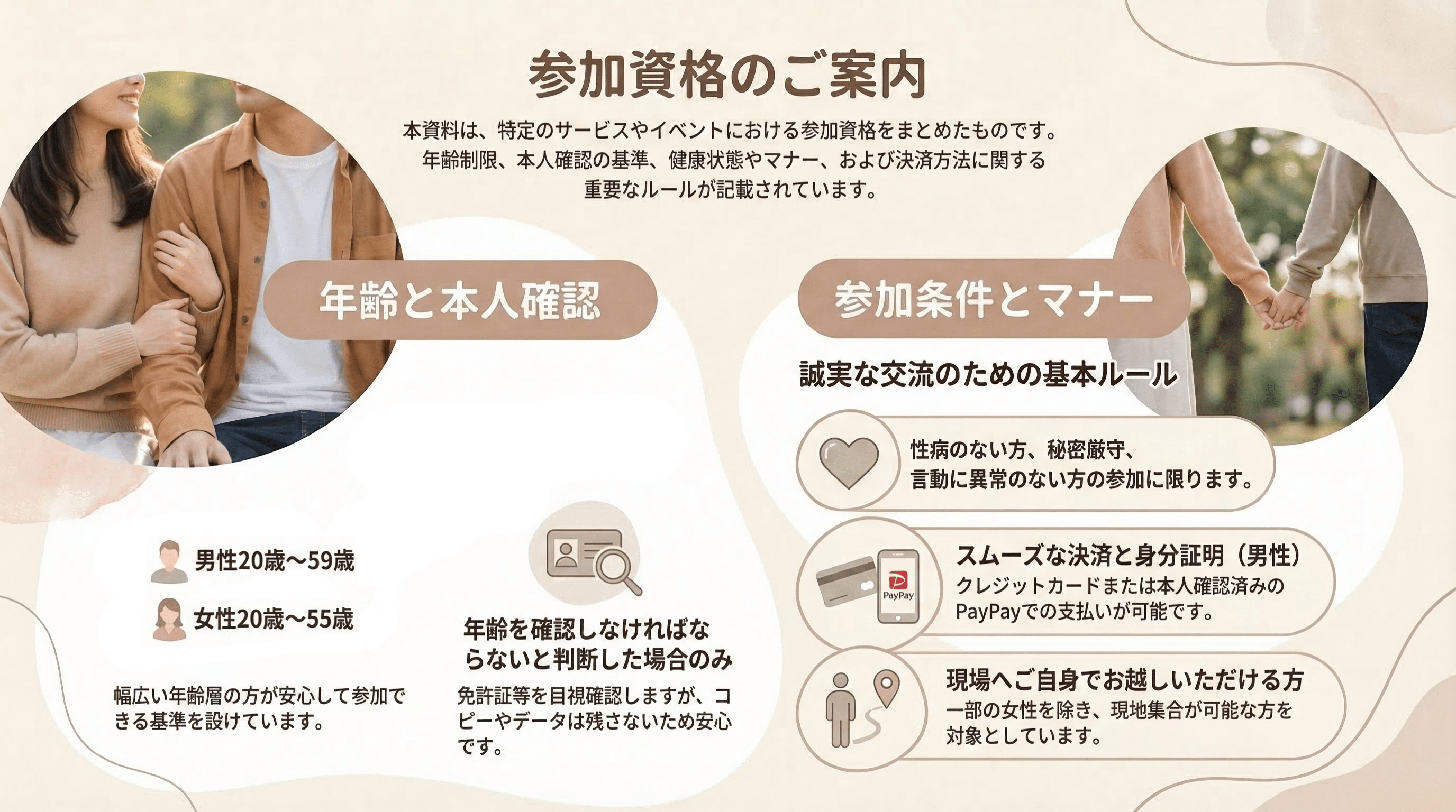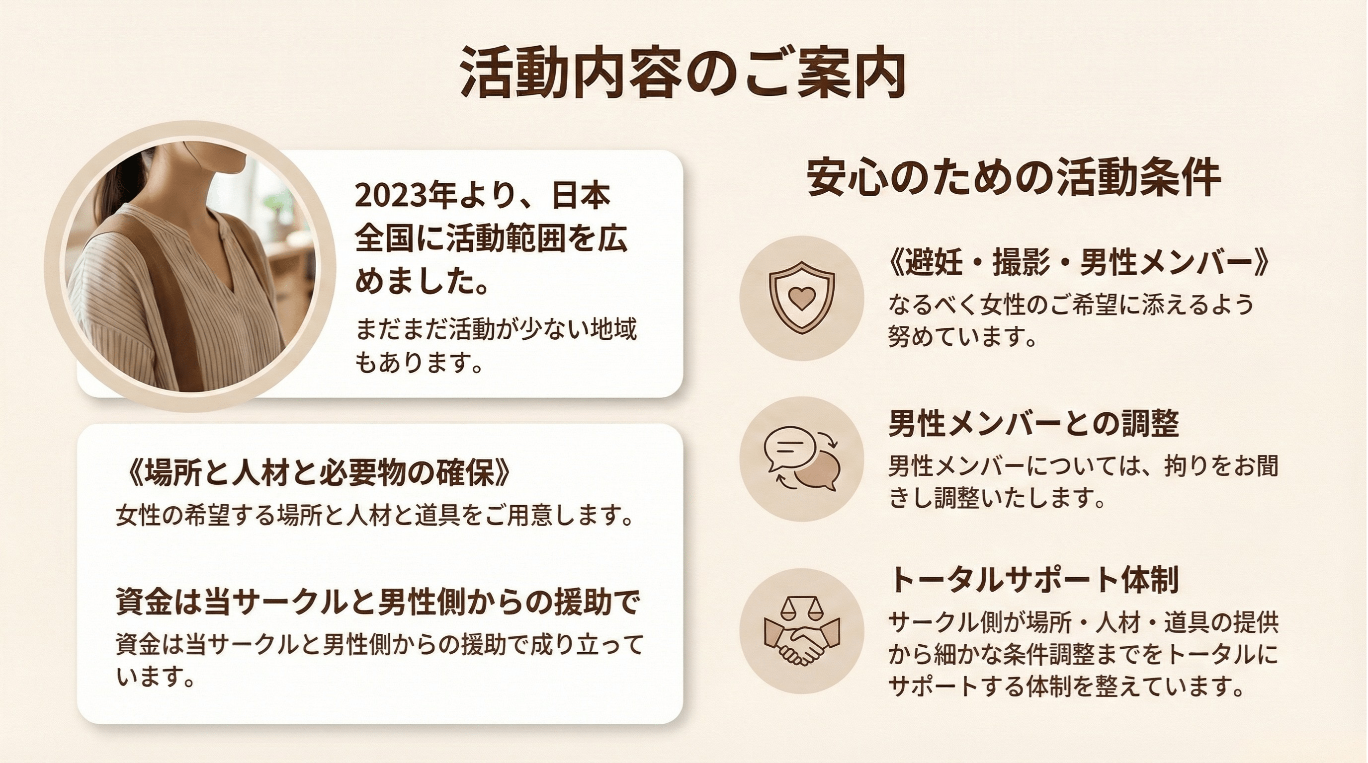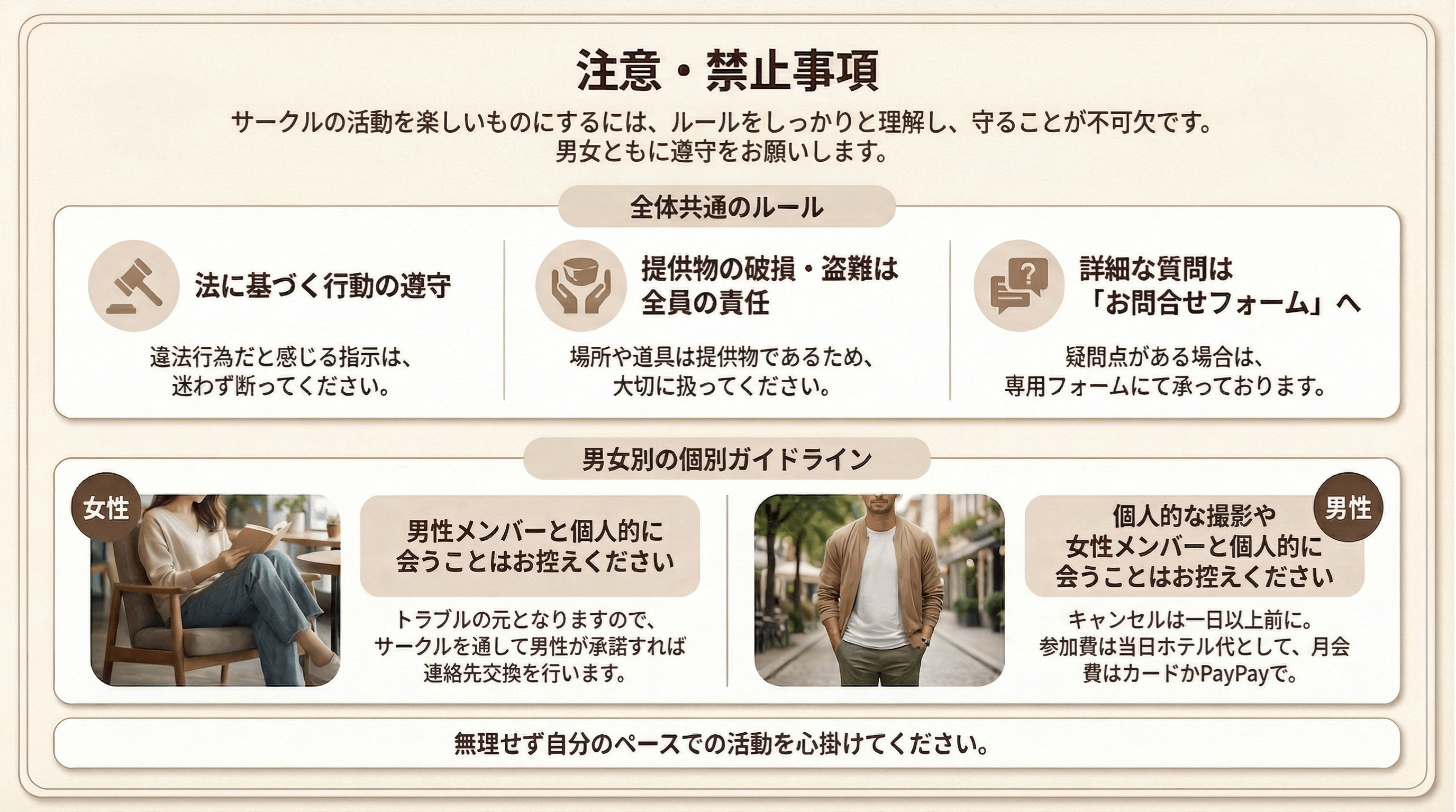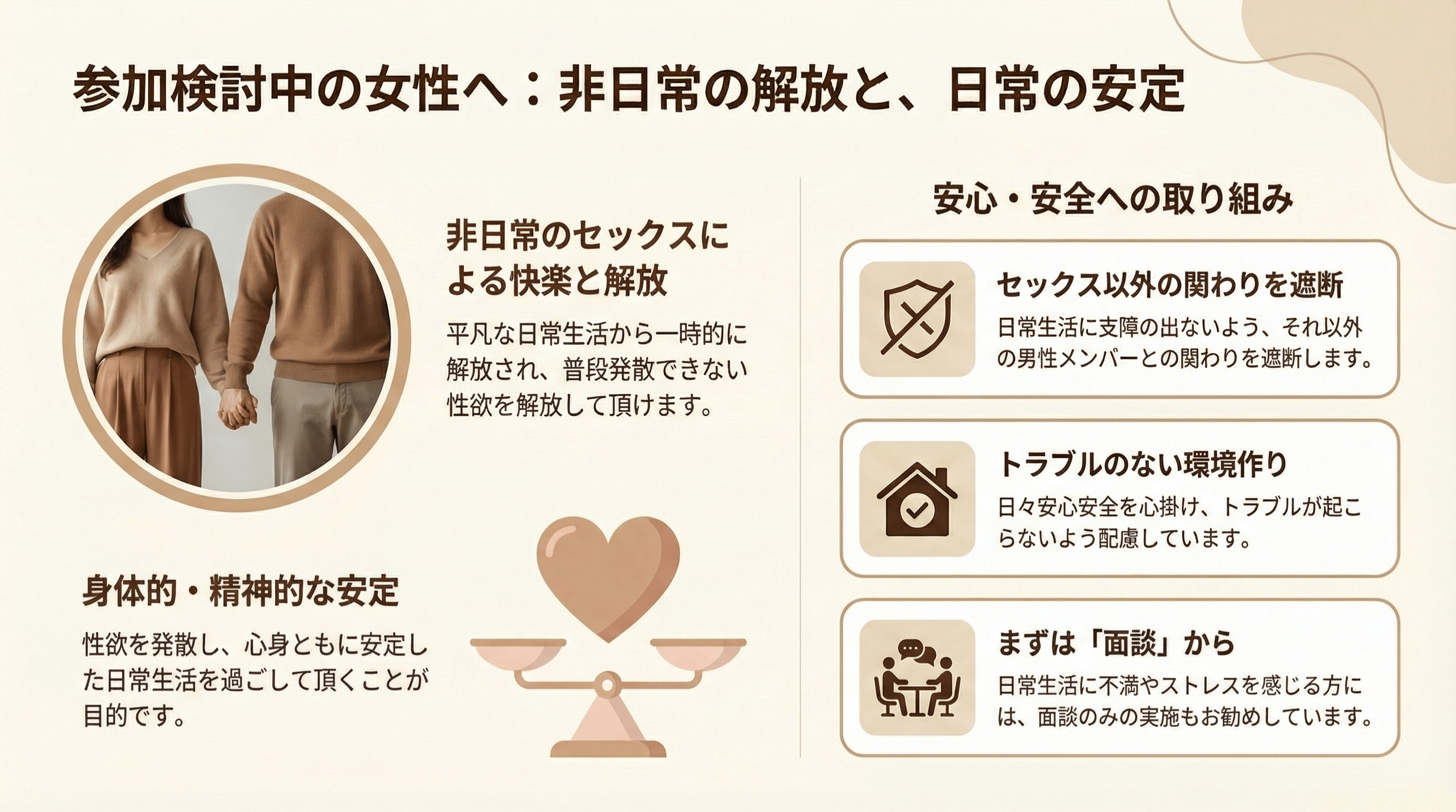 このサークルは、セックスが好きで集まった男女が、サークルのメンバーとして1度会い、お互い恋愛感情を持たずに「非日常時間」を共有し、溢れる性欲を「安心安全」に発散させることを目的としています。